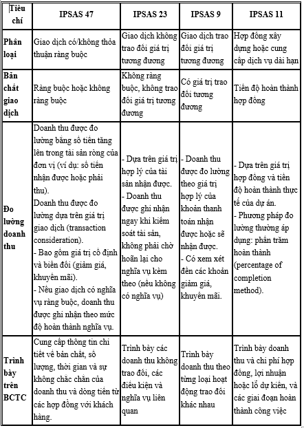 Có thể tóm tắt những điểm khác biệt giữa IPSAS 47, IPSAS 9, IPSAS 11 và IPSAS 23 như sau:
