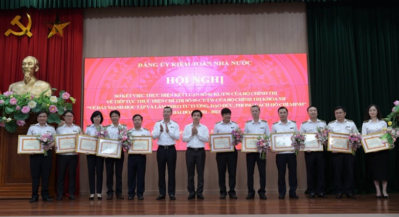 Phó Bí thư Đảng ủy Khối các cơ quan Trung ương Nguyễn Quang Trường và Tổng KTNN Ngô Văn Tuấn trao tặng Bằng khen cho các tập thể, cá nhân Phát biểu chỉ đạo tại hội nghị, đồng chí Nguyễn Quang Trường, Phó Bí thư Đảng ủy Khối các cơ quan Trung ương đánh giá cao việc thực hiện Kết luận số 01-KL/TW của Bộ Chính trị về tiếp tục thực hiện Chỉ thị số 05-CT/TW của Bộ Chính trị khóa XII “Về đẩy mạnh học tập và làm theo tư tưởng, đạo đức, phong cách Hồ Chí Minh” tại Đảng bộ KTNN đã đạt được những kết quả tốt, tạo điểm nhấn quan trọng, góp phần đưa việc học tập và làm theo tư tưởng, đạo đức, phong cách Hồ Chí Minh trở thành nội dung quan trọng của công tác xây dựng, chỉnh đốn Đảng, góp phần xây dựng đảng bộ, chi bộ trong sạch, vững mạnh; xây dựng đội ngũ cán bộ, đảng viên, kiểm toán viên nhà nước có phẩm chất đạo đức, bản lĩnh chính trị, văn hóa ứng xử và chuyên môn nghiệp vụ; ngăn chặn, đẩy lùi sự suy thoái về tư tưởng chính trị, đạo đức, lối sống và những biểu hiện “tự diễn biến”, “tự chuyển hóa” trong nội bộ; đẩy mạnh đấu tranh phòng, chống tham nhũng, lãng phí, tiêu cực trong toàn Đảng bộ.