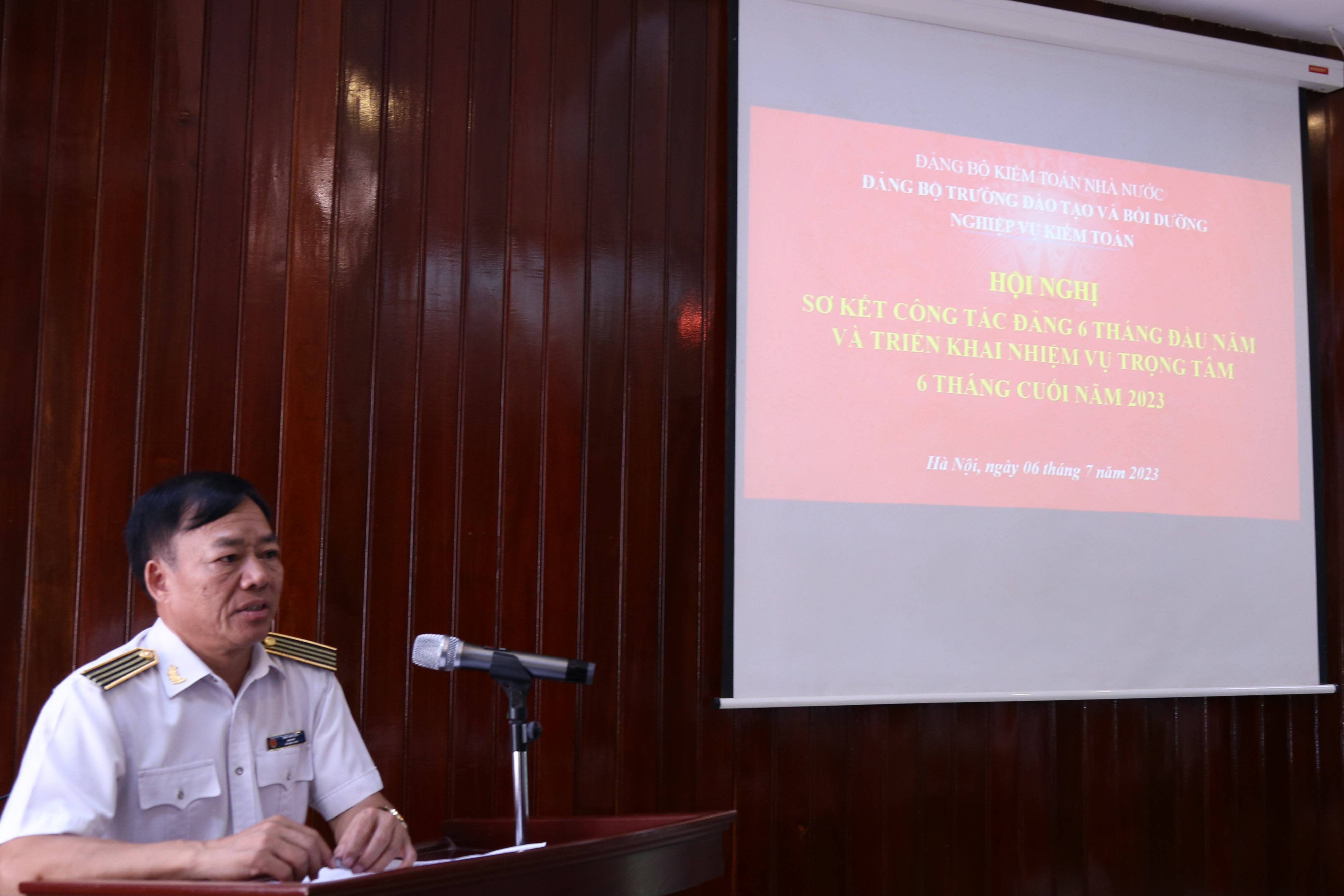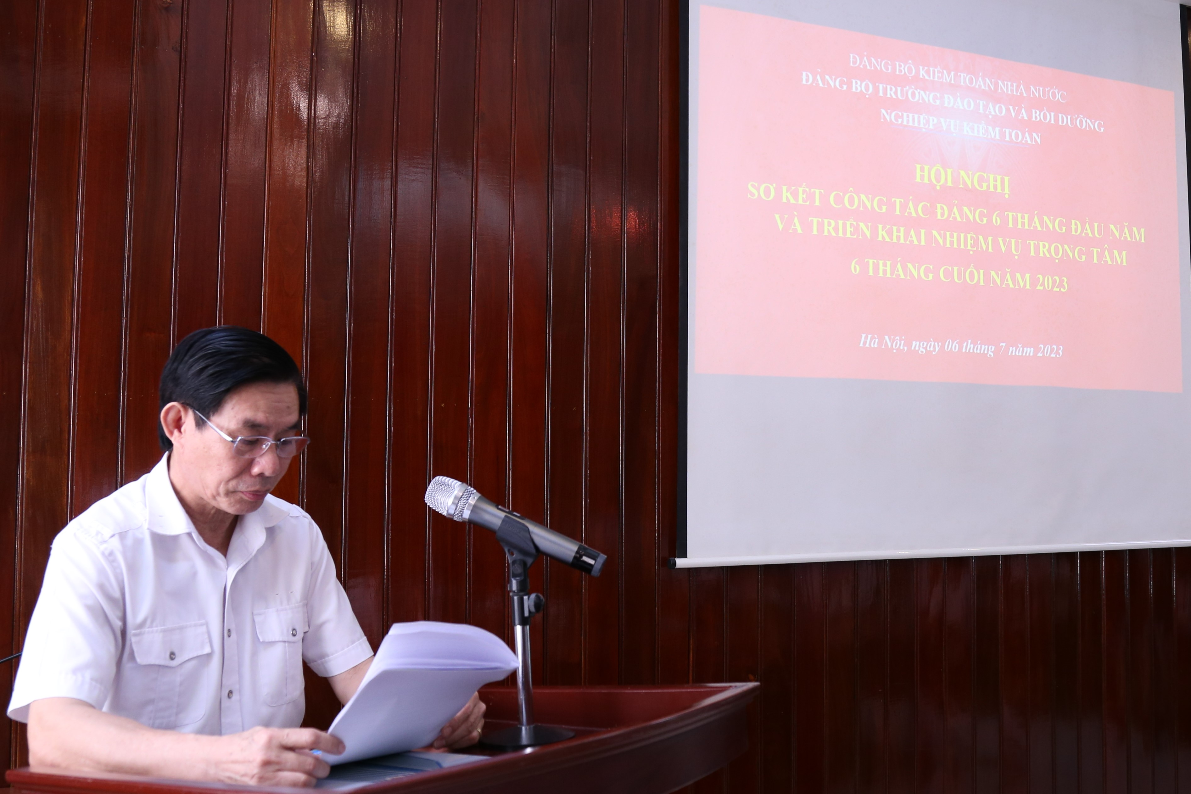 (khoahockiemtoan.vn) - Ngày 6/7/2023,  Đảng bộ Trường Đào tạo và Bồi dưỡng nghiệp vụ kiểm toán (Trường) tổ chức Hội nghị sơ kết 6 tháng đầu năm và triển khai thực hiện nhiệm vụ công tác Đảng 6 tháng cuối năm 2023, tham dự Hội nghị có đồng chí Trần Kim Lộc - Bí thư Đảng bộ, Giám đốc trường, các đồng chí Lãnh đạo Trường và toàn thể các đảng viên trong Đảng bộ.