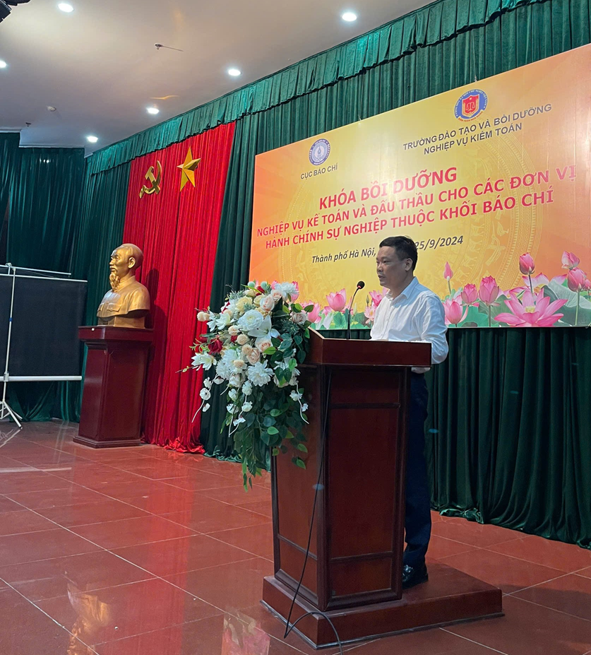 (khoahockiemtoan.vn) - Sáng ngày 23/9/2024, tại trụ sở 111 Trần Duy Hưng, Cầu Giấy, Hà Nội, Trường Đào tạo và Bồi dưỡng nghiệp vụ kiểm toán (Trường) và Cục Báo chí phối hợp tổ chức khai giảng Lớp đào tạo“Bồi dưỡng nghiệp vụ kế toán và đấu thầu cho các đơn vị hành chính sự nghiệp thuộc khối Báo chí”. Dự khai giảng Lớp học có ông Trần Kim Lộc - Giám đốc Trường, ông Nguyễn Huy Hoàng, Đỗ Hồng Công - Phó Giám đốc Trường; ông Đặng Khắc Lợi - Phó Cục trưởng Cục Báo chí; lãnh đạo đại diện Ban Tổ chức Lớp học cùng các giảng viên, học viên.