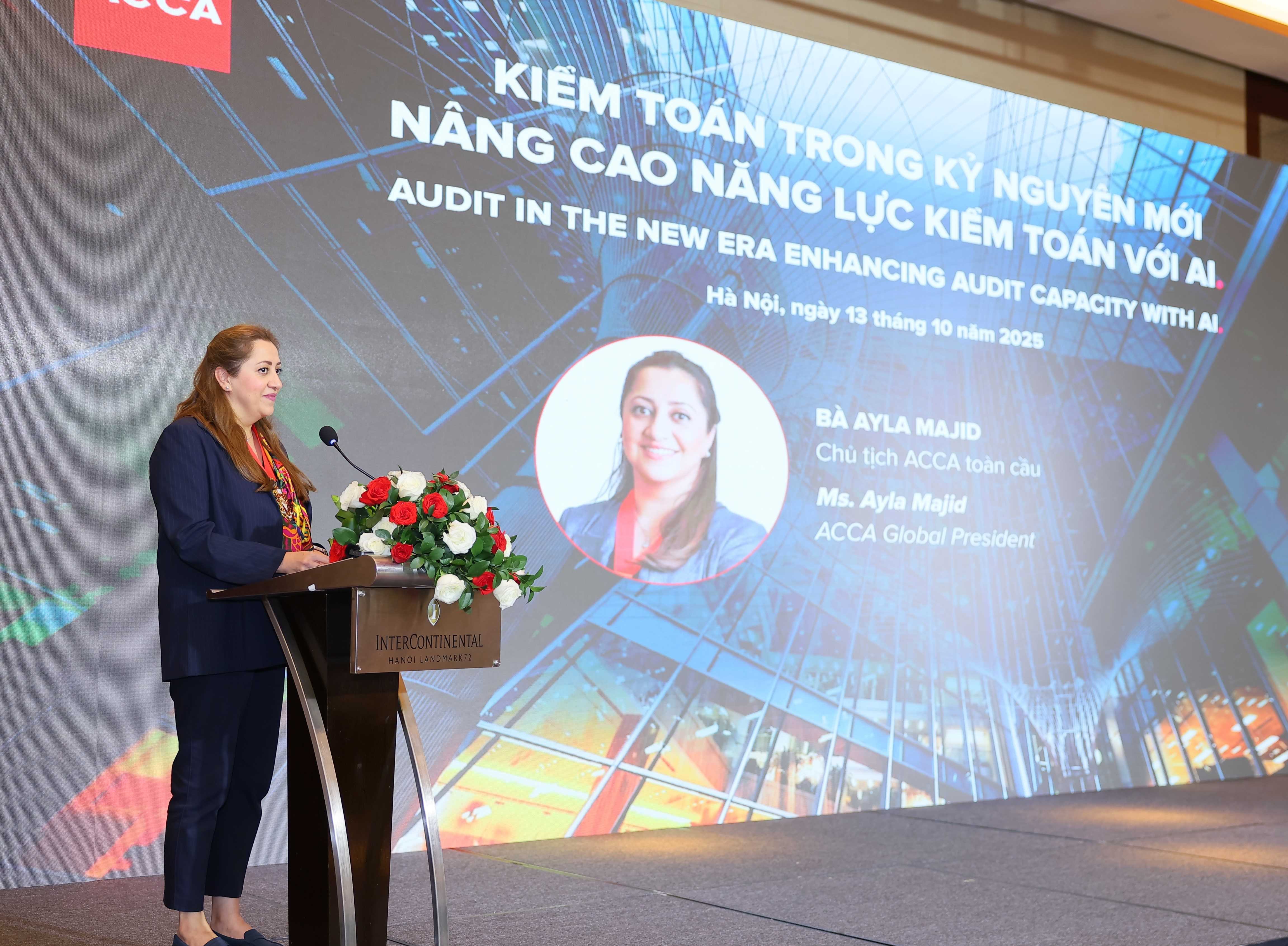 Kiểm toán trong kỷ nguyên mới - năng lực, công nghệ và hợp tác Chia sẻ những giải pháp và kinh nghiệm quốc tế, Chủ tịch ACCA toàn cầu Ayla Majid nhấn mạnh rằng việc ứng dụng AI trong kiểm toán chỉ thực sự hiệu quả khi kết hợp song song giữa đổi mới công nghệ và phát triển năng lực con người. AI không thể thay thế kiểm toán viên mà là công cụ giúp họ mở rộng phạm vi kiểm toán, phân tích dữ liệu toàn diện và nâng cao tính minh bạch trong hoạt động tài chính công.