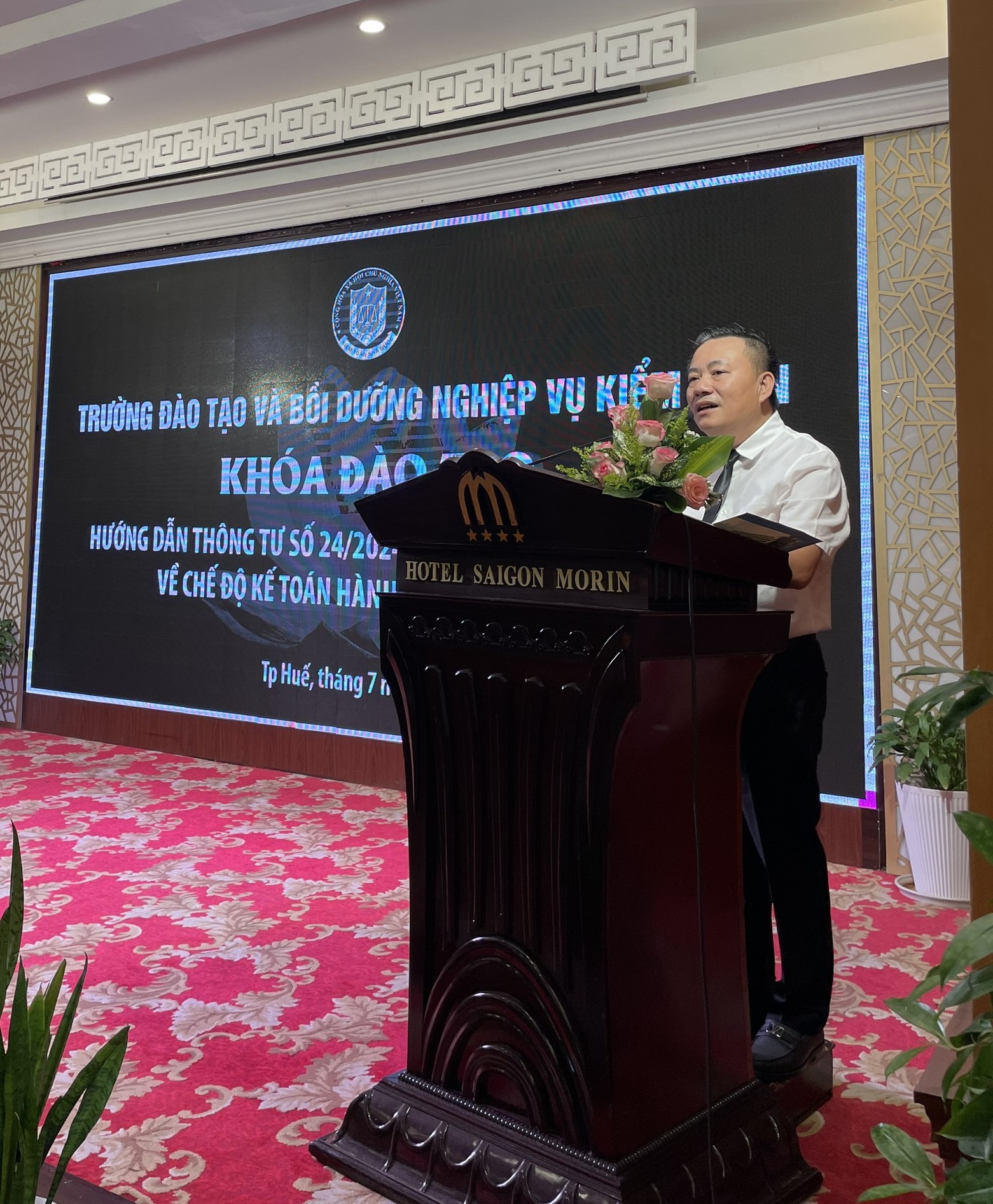 (khoahockiemtoan.vn) - Sáng ngày 25/7/2024, tại tỉnh Thừa Thiên Huế, Trường Đào tạo và Bồi dưỡng nghiệp vụ kiểm toán tổ chức khai giảng Lớp tập huấn: “Hướng dẫn Thông tư số 24/2024/TT-BTC của Bộ Tài chính về chế độ kế toán hành chính sự nghiệp”, đến dự khai giảng Lớp học có ông Nguyễn Quốc Cường - Phó Giám đốc Sở Tài chính tỉnh Thừa Thiên Huế;  PGS.TS Ngô Thanh Hoàng - nguyên Trưởng bộ môn Kế toán công, Trưởng Ban Quản lý Khoa học, Học viện Tài chính và các học viên tham dự Lớp tập huấn. Ông Nguyễn Huy Hoàng - Phó Giám đốc Trường Đào tạo và Bồi dưỡng nghiệp vụ kiểm toán khai giảng Lớp học.