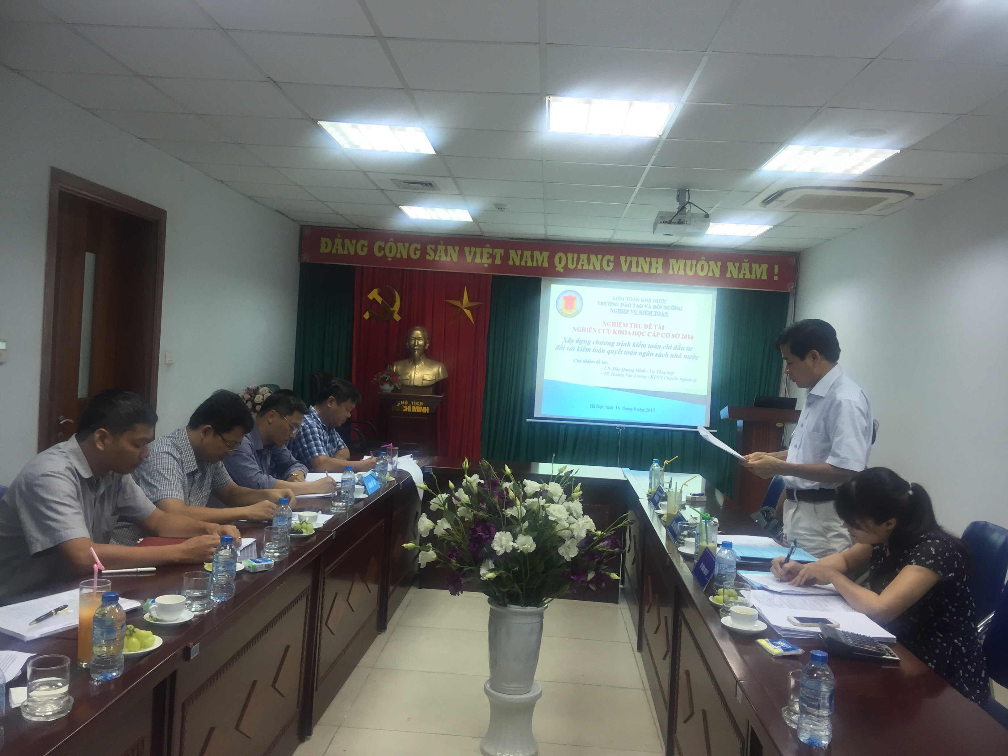 Ngày 16/8/2017, tại Trường Đào tạo và Bồi dưỡng nghiệp vụ kiểm toán, Hội đồng khoa học KTNN đã tổ chức nghiệm thu đề tài cấp Cơ sở “Xây dựng chương trình kiểm toán chi đầu tư đối với kiểm toán quyết toán ngân sách nhà nước” do TS. Hoàng Văn Lương và CN. Đào Quang Minh làm đồng chủ nhiệm.