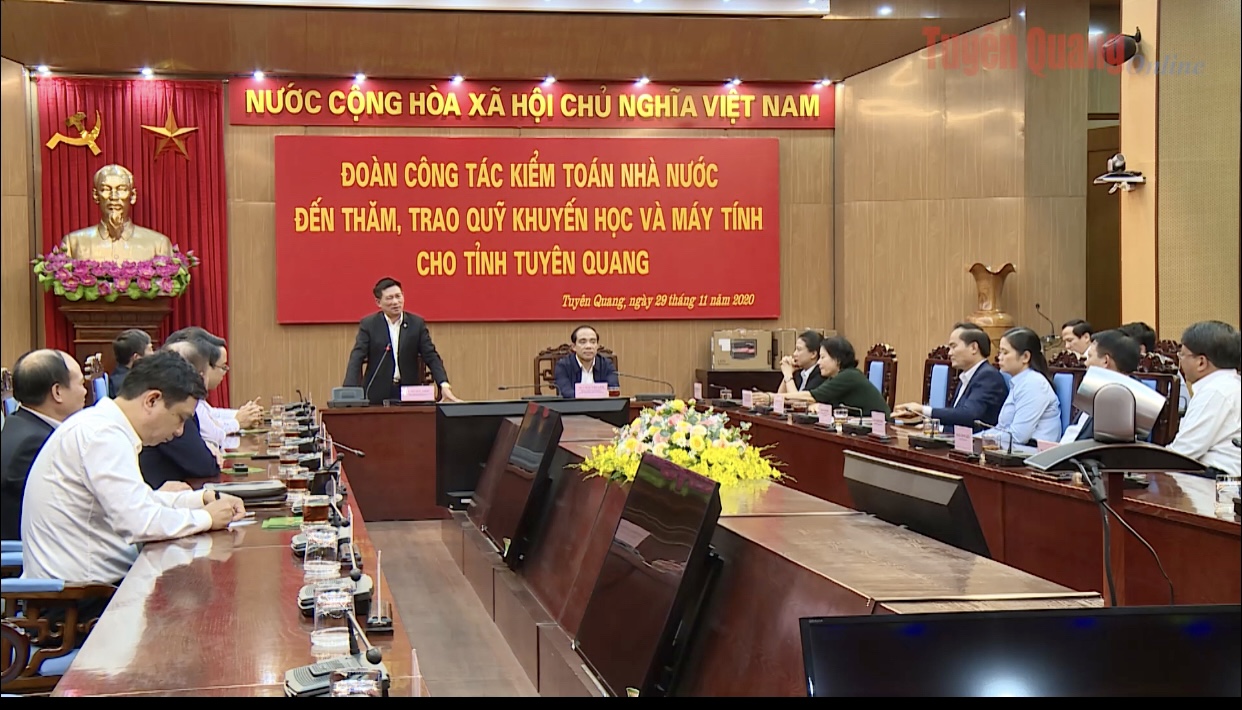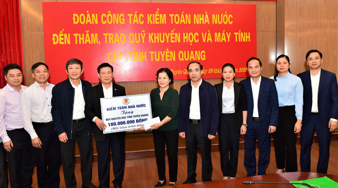 Nhân dịp này, thay mặt Đoàn công tác Tổng Kiểm toán nhà nước đã trao tặng Quỹ Khuyến học tỉnh 100 triệu đồng và 45 máy vi tính.