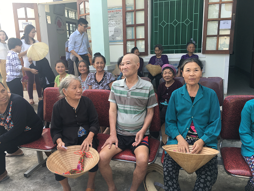(Bà con nhận số và ngồi đợi đến lượt đón tiếp thăm khám)